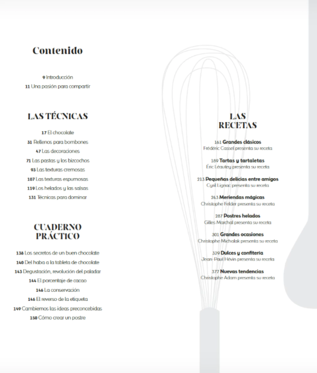 Una obra esencial, verdaderamente pedagógica e ilustrada por completo, que seducirá tanto al principiante como al profesional. Más de 100 técnicas de pastelería para saber todo sobre el chocolate (atemperado, ganaches, mousses, decoraciones, glaseados...) Más de 150 recetas: todos los grandes clásicos (éclairs, bosque negro, coulant, mousses, tartas...), postres de tendencia (macarons, vasitos...), así como helados y confitería. Un compendio de saber hacer, fruto de las formaciones que se imparten en la École du Grand Chocolat. Se revelan las técnicas de trabajo del chocolate utilizando un lenguaje claro, preciso y comprensible y para el público en general. Todos los métodos se explican a través de fotografías paso a paso para realizar con éxito sus postres. Con los secretos de los mejores chefs pasteleros y sus recetas emblemáticas: Christophe Michalak (Plaza Athénée), Gilles Marchal (Maison du Chocolat), Christophe Adam (Fauchon), Jean-Paul Hévin, Christophe Felder, Frédéric Cassel, Éric Léautey...