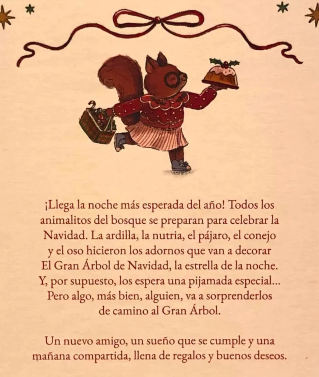 En el bosque todos se preparan para la noche más esperada del año. La ardilla, la nutria, el pájaro, el conejo y el oso llegan para decorar el Gran Árbol de Navidad y compartir su tradicional pijamada.
