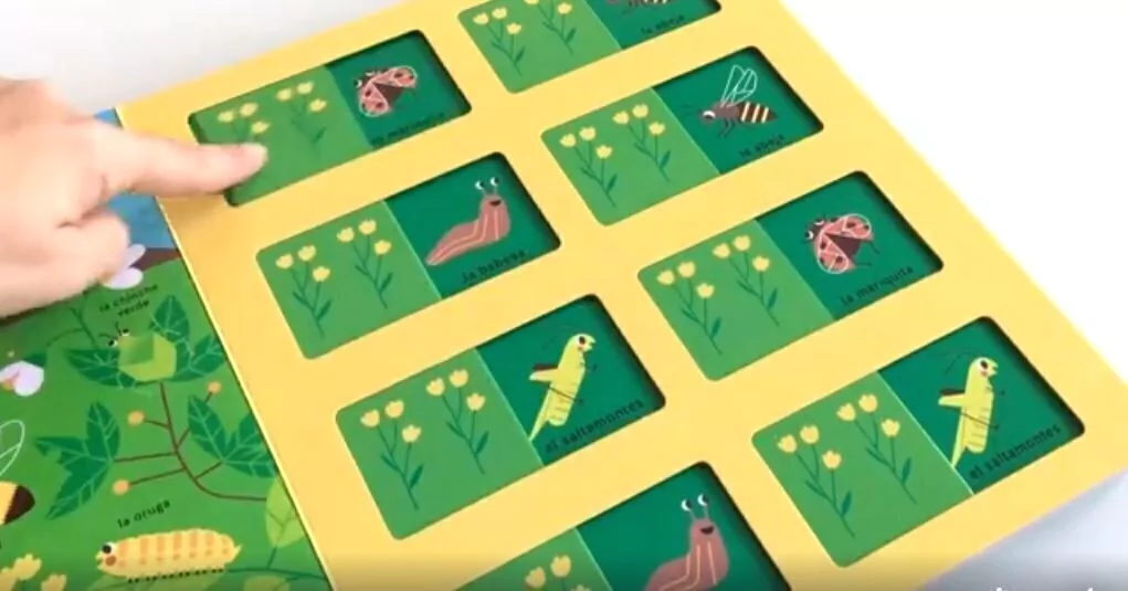 Un libro todo de cartón con cinco propuestas del juego del memory para aprender los nombres de los pequeños animales de cinco entornos diferentes: el campo, el estanque, el bosque, bajo tierra y la noche. En cada página izquierda hay una escena con varias propuestas de actividades de observación. En cada página derecha se presenta el juego del memory con cuatro pares de cartoncillos para relacionar.