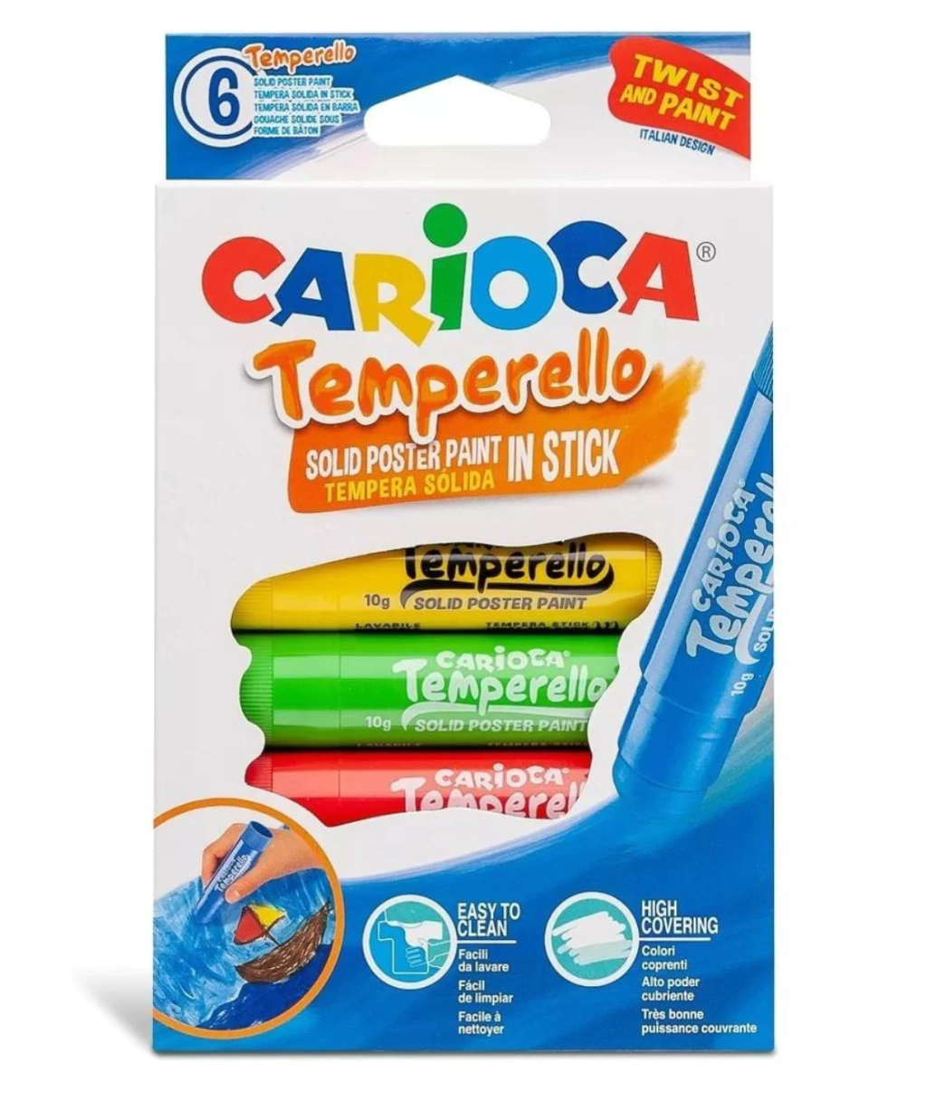 Una caja de 6 témperas sólidas Temperello de colores lavables con alta cobertura aplicable sobre folios, cartulinas, madera y cartón.