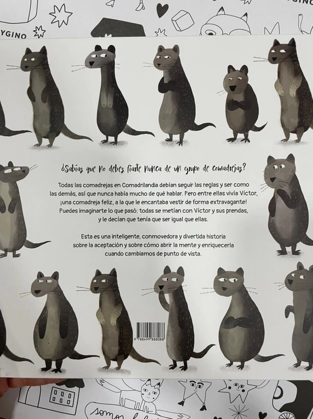 Sabías que no debes fiarte nunca de un grupo de comadrejas? Todas las comadrejas en Comadrilandia debían seguir las reglas y ser como las demás. Nunca había mucho de qué hablar. Así que imagina su confusión cuando se encuentran con Víctor, íuna comadreja chiflada, obsesionada con su vestimenta! Todas se confabulan contra Víctor y sus prendas y le urgen a cambiar. Esta es una inteligente, conmovedora y divertida historia sobre la aceptación y sobre cómo abrir la mente y enriquecerla cuando cambiamos de punto de vista.